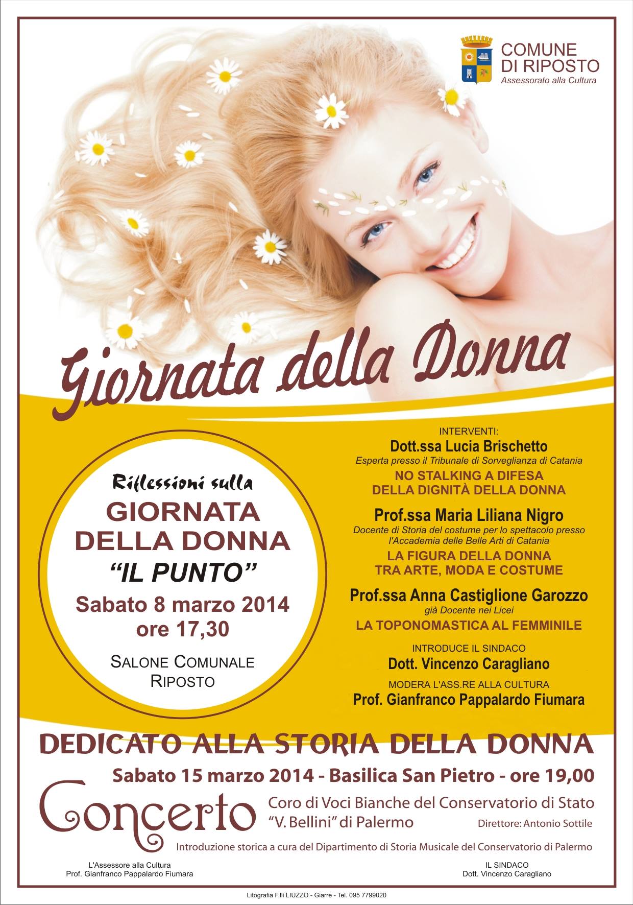 Riflessioni sulla giornata della donna, e’ il titolo dell’iniziativa promossa dall’assessore alla Cultura Gianfranco Pappalardo Fiumara, in programma per sabato 8 marzo alle 17.30, nel salone del Vascello del Municipio di Riposto. Interverranno il sindaco Enzo Caragliano e l’assessore alla Cultura, Gianfranco Pappalardo Fiumara; la dott.ssa Lucia Brischetto, esperta presso il Tribunale di Sorveglianza di Catania, parlerà su: “No stalking a difesa della dignità della donna”; la prof.ssa Maria Liliana Nigro, docente di Storia del costume per lo spettacolo presso l’accademia delle Belle Arti di Catania, invece, parlerà su: “La figura della donna tra arte, moda e costume”; la prof.ssa Anna Castiglione Garozzo, infine, proporrà il tema: “La toponomastica al femminile”.