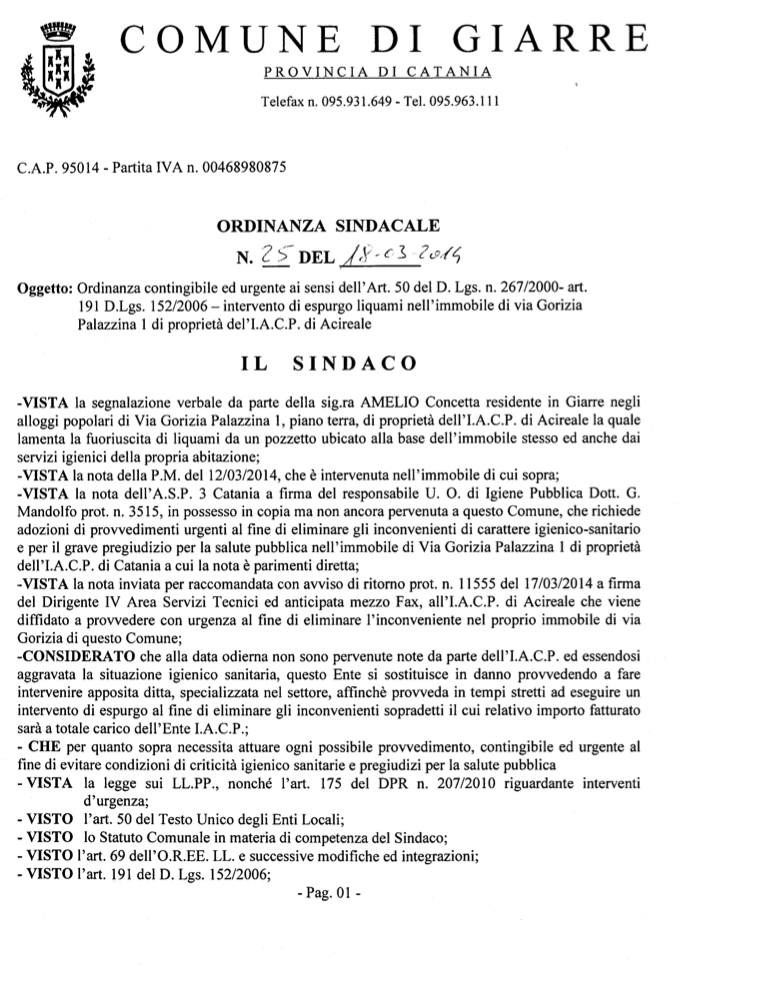 Vivere tra i liquami nel 2014, nelle palazzine popolari di via Gorizia, nel quartiere Jungo a Giarre. 15 nuclei familiari assistono inermi al rimpallo tra Iacp e Comune di Giarre per un intervento urgente di bonifica e spurgo. Nel frattempo l’Asp ha accertato gravi carenze igienico sanitarie e rischi per la salubrità dei residenti. Ieri sera gli inquilini di via Gorizia hanno occupato pacificamente il Consiglio comunale chiedendo al sindaco Bonaccorsi di intervenire.