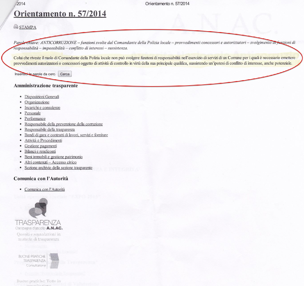 Per queste ragioni al comandante della Polizia Locale non può essere affidata la responsabilità della S.U.A.P., come peraltro ribadito anche dalla SI.A.PO.L. (sindacato autonomo Polizia Locale); alla luce, quindi, delle osservazioni dell’Anac, il comandante Cannavò non può essere investito di responsabilità in materia di commercio o edilizia: la sua funzione è riferibile soltanto ad attività di controllo del territorio sotto il profilo di polizia e di ordine pubblico”.