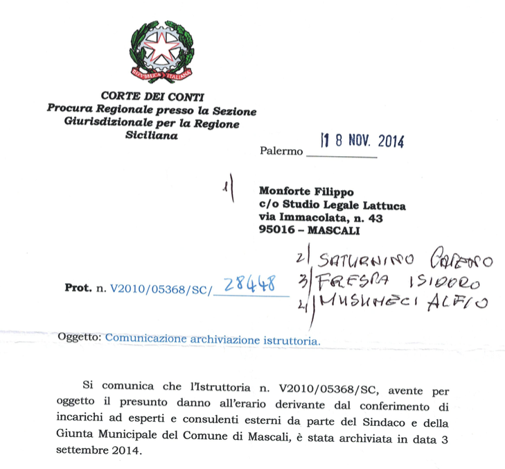 CORTELa Procura regionale della Corte dei Conti con propria nota ha comunicato che l’istruttoria relativa ad un presunto danno all’erario derivante dl conferimento di incarichi ad esperti e consulenti esterni da parte del sindaco pro tempore di Mascali, Filippo Monforte e della sua Giunta, è stata archiviata il 3 settembre 2014.