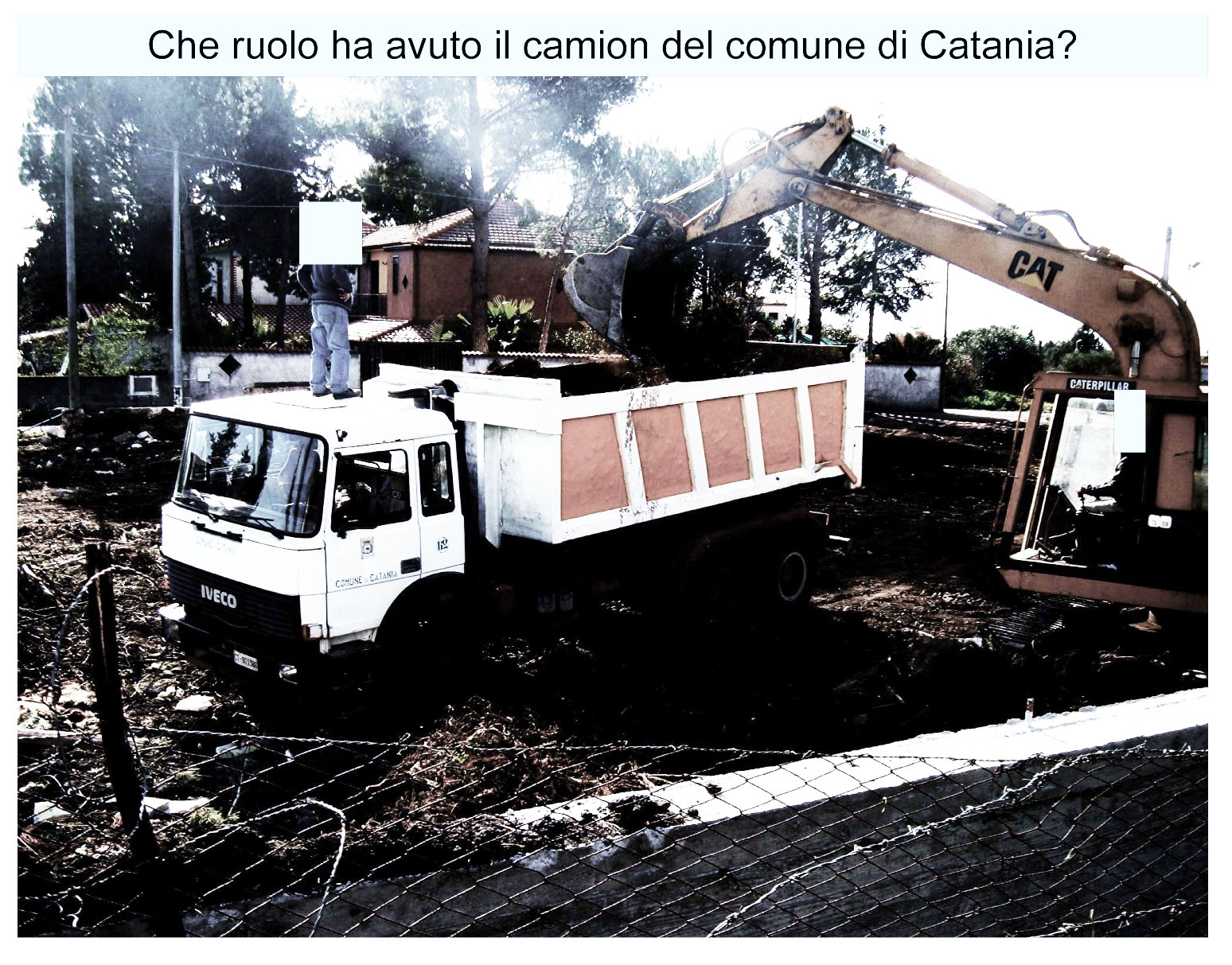 «Il sindaco di Mascalucia anziché fermare la speculazione edilizia minaccia chi difende gli interessi dell’ambiente e della comunità. Al Comune nessuno ha visto il cartello con il falso permesso a costruire (foto 1), la distruzione di un boschetto (foto 2) e la costruzione di 72 metri di muraglione. Infatti, al Comune di Mascalucia nessuno distingue un edificio pubblico, da un edificio ad uso pubblico, o una scuola pubblica, da una chiesa e da appartamenti privati, un boschetto con alberi di alto fusto da un deposito di pietrame e spazzatura, dove sono stati caricati e scaricati materiali sospetti, anche con un camion del Comune di Catania (foto 3); i lavori di sistemazione del terreno, da uno sbancamento del territorio per un’altezza di oltre due metri; un muraglione di 72 metri con basamento in cemento armato distante dal confine, da un muro di recinzione.