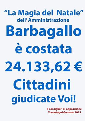 altro pesante attacco al sindaco e alla sua amministrazione. “Galeotto” sembrerebbe il recente Natale 2014 (vedi la foto del manifesto in questione), costato al Comune di Trecastagni, secondo i consiglieri della minoranza, 24.133.62 euro.