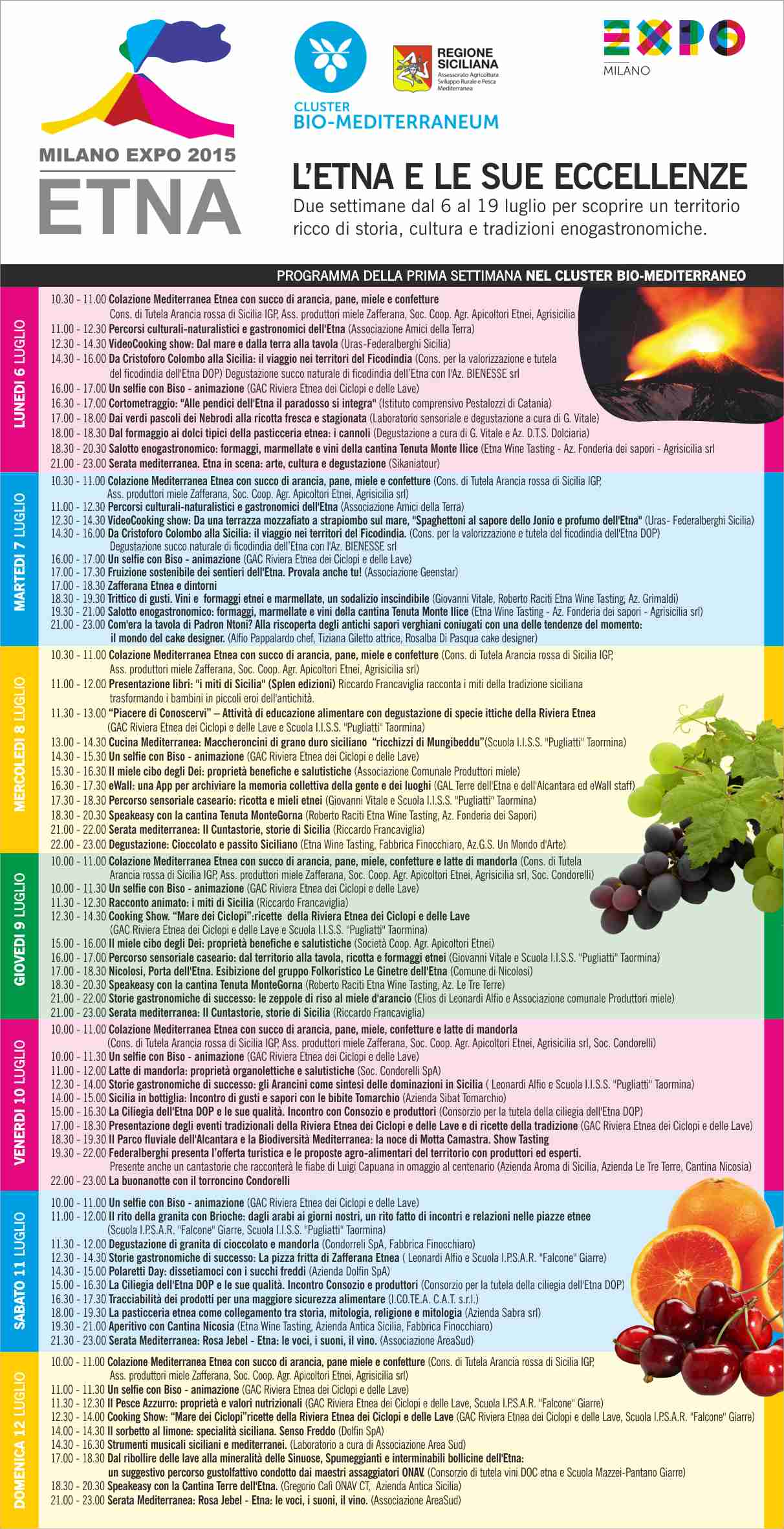 Dal vulcano più alto d’Europa a Expo è lo slogan che il Gal Terre dell’Etna e dell’Alcantara, il Gal Etna e il Gac Riviera Etnea dei Ciclopi e delle Lave hanno coniato per annunciare alla stampa i numerosi eventi e le attività che saranno presentate all’interno del Cluster “Bio-mediterraneum” a Expo 2015. Un grande progetto che coinvolge l’intero territorio, dalle istituzioni pubbliche, alle aziende, all’associazionismo, per promuovere il territorio e le eccellenze alimentari dell’Etna, dal mare alla montagna.