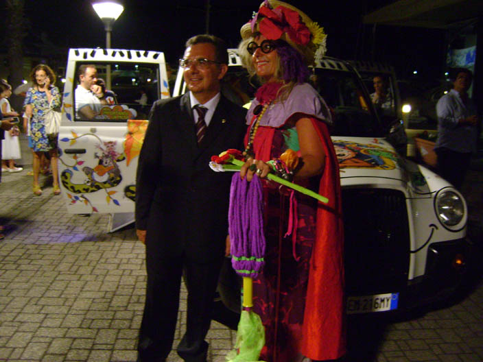 Con il suo taxi stravagante e pieno di pupazzi, Caterina Bellandi, venerdì sera, è stata accolta nel piazzale antistante il salone del circolo velico Marina di Riposto, ospite del Rotary club di Giarre riviera jonico-etnea. E incontrarla è stata una festa dei bambini che in tanti, accompagnati dai genitori, hanno voluto fare una foto con lei, accanto al suo Taxi “Milano 25” o chiederle un autografo. Il lavoro di Caterina Bellandi è quello di rendere felici i bambini, soprattutto quelli più provati dalle difficoltà che vanno a curarsi all’ospedale pediatrico Meyer di Firenze. Lei sorridente, con un grande cappello fiorito, indossando vesti variopinte, ninnoli e bracciali che pendono dappertutto li accompagna gratis, si fa chiamare “zia Caterina” e il suo stile è una via di mezzo tra Mary Poppins e Pacth Adams, simile anche a quello di un altro toscano, Roberto Benigni ne “La vita è bella” che con giochi e battute non ha fatto pesare al figlio la vita dentro un campo di concentramento.