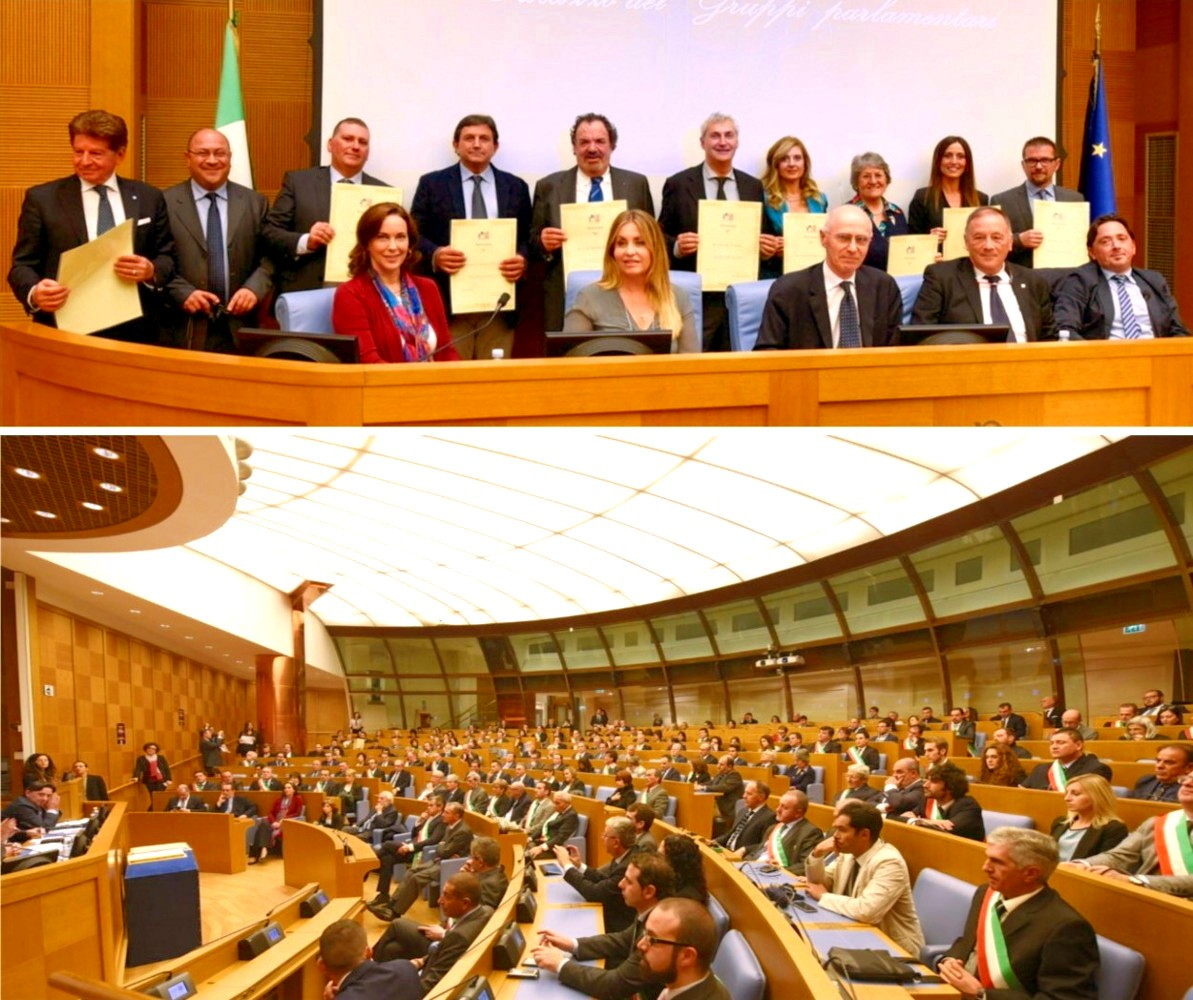 FOTO: Laura Vaccaro a Roma mentre ritira la certificazione “American Friendly” dalle mani dell’On. Polidori ed, accanto, con la figlia Lorena Nuciforo; nell’altra immagine, il gruppo degli imprenditori destinatari dell’attestazione e l’aula dei gruppi parlamentari il giorno della cerimonia di consegna