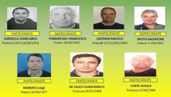 Tutti i nomi degli uomini posti agli arresti domiciliari: Sergio Leonardi, Giuseppe Forte, Tirendi Alessandro, Salvatore Carlo Forte, Eugenio Barbarino, Damiano Sciuto, Giuseppe Savino, Giancarlo Sardella, Angelo Laudani, Salvatore Sporto, Luigi Barbato, Natale Forte.