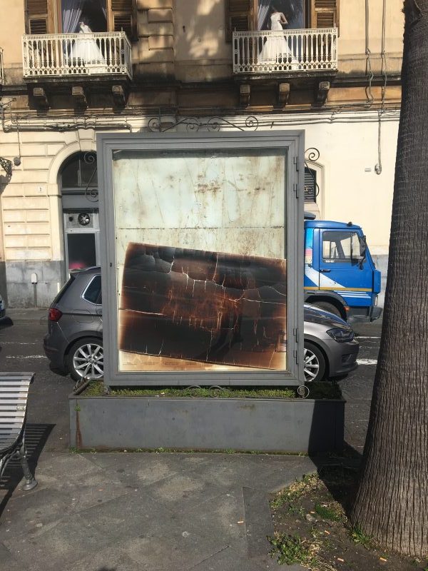 Il corpo illuminante in vetro giace ancora seminascosto dalla fitta vegetazione, all’interno della sottostante aiuola. Gli arredi della piazza si presentano dismessi, come quel pannello turistico posizionato a ridosso di uno dei candelabri con le informazioni storico-turistiche della città, rese illeggibili dalle infiltrazioni che hanno danneggiato la mappa della città e la leggenda di notizie, nonostante sia protetta dal vetro.