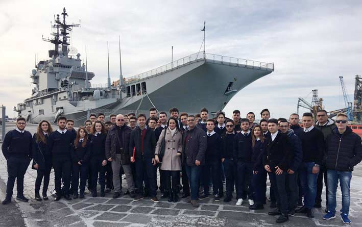 A bordo della nave gli allievi nautici hanno potuto visitare l’hangar, necessario per il ricovero e la manutenzione dei mezzi in navigazione, dotato di elevatori che lo collegano al ponte di volo dal quale è possibile il decollo verticale e l’appontaggio di aerei ed elicotteri.