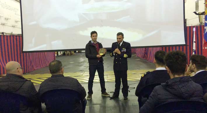 Come da tradizione della marineria italiana, in ricordo della visita, il Comandante ha donato un Crest al nautico di Riposto, ritirato per l’occasione dal C.L.C. Armando Patané.
