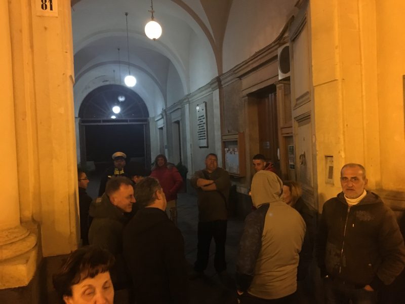 La protesta degli inquilini si e poi spostata al Comune con l’occupazione del corridoio del Municipio (foto a sinistra). Sul posto adesso anche i carabinieri della Compagnia di Giarre. Il sit-in è proseguito sino alle 20, quando poi il gruppo di inquilini, dinanzi la rassicurazione che domani alle 9 una ditta incaricata dal Comune effettuerà un intervento di spurgo, ha deciso di sospendere la protesta davanti al palazzo comunale di via Callipoli.
