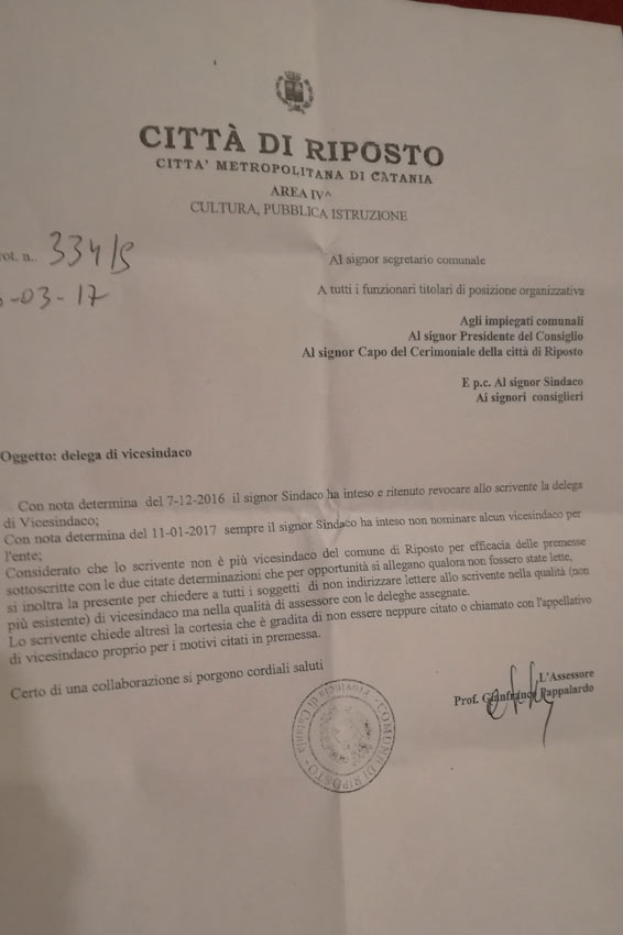 E’ il contenuto di una lettera (nella foto a destra) dello stesso assessore Pappalardo Fiumara, datata 16 marzo, che ieri ha sorpreso i consiglieri, suscitando le loro domande all’inizio della seduta del Consiglio comunale. Sorpresa, secondo Pappalardo Fiumara, ingiustificata, visto che sono note a tutti le determine con cui il sindaco ha revocato la delega di vicesindaco a Pappardo Fiumara, prima affidata all’assessore Grasso e poi con ulteriore determina revocata, per cui il Comune di Riposto da due mesi non ha più vicesindaco.