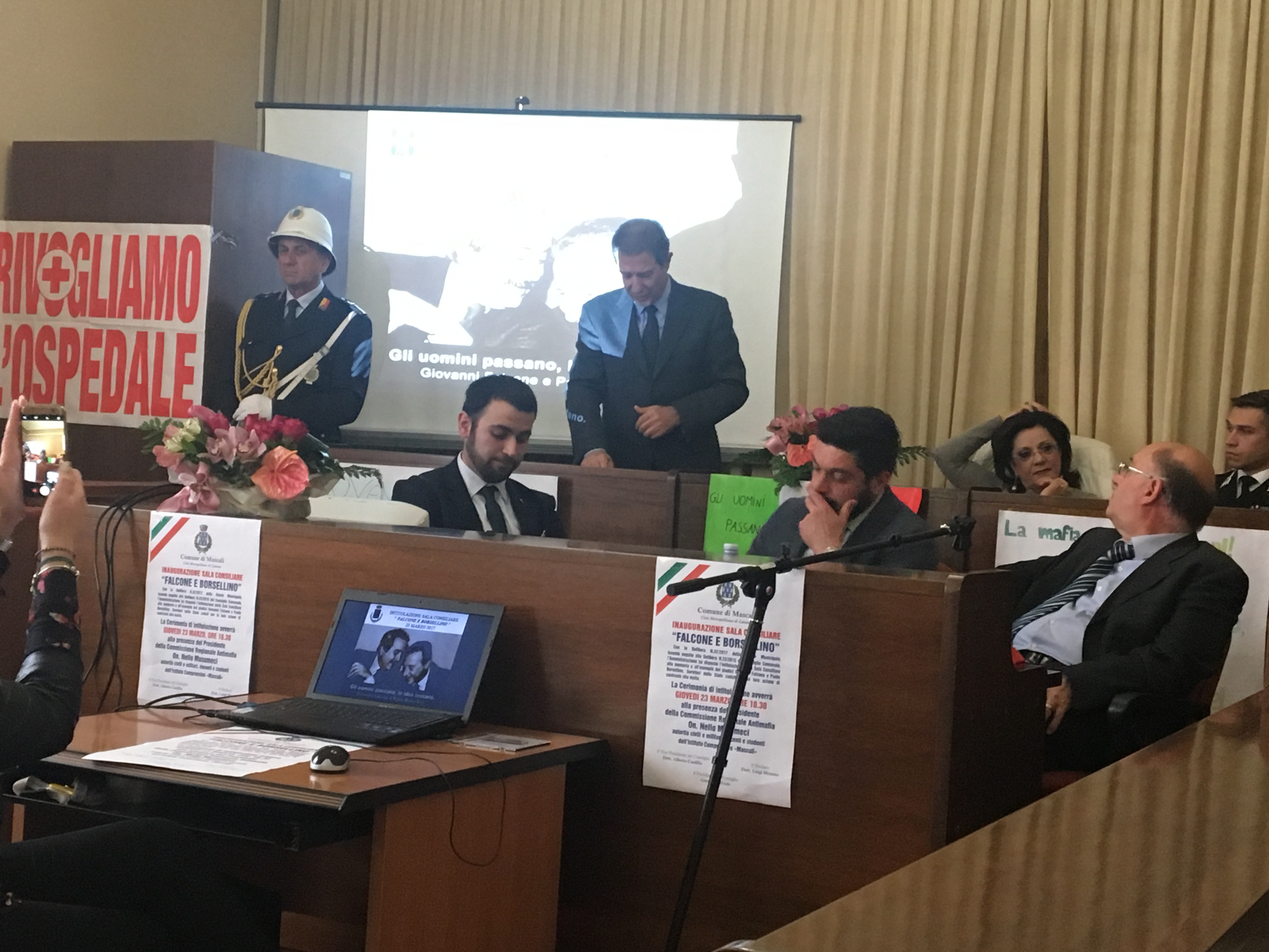 Alla presenza del presidente della Commissione Regionale Antimafia Nello Musumeci, del Procuratore di Catania Marisa Scavo, del sindaco di Mascali Luigi Messina, delle autorità civili e militari, dei docenti, degli alunni dell’Istituto Comprensivo Mascali e del dirigente scolastico Maria Cettina Maccarone, la sala consiliare del Comune mascalese è stata intitolata alla memoria dei giudici Giovanni Falcone e Paolo Borsellino per la loro azione di contrasto alla mafia.