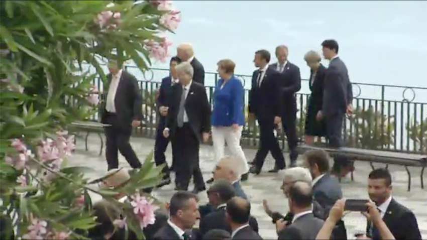 Guidati dal presidente del Consiglio Paolo Gentiloni, blindati da decine e decine di uomini delle forze dell’ordine, sei leader del G7 hanno poi attraversato a piedi il centro di Taormina. Non c’era il presidente degli Stati Uniti Donald Trump, che li ha raggiunti dopo sul belvedere, probabilmente per ragioni di sicurezza.
