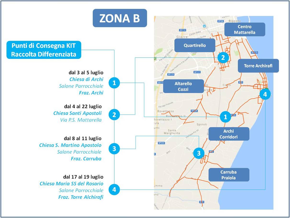 “L’attivazione del servizio per tutta la nuova area – precisa l’ing. Daniela Alchirafi di Tech servizi – avverrà a partire dal 24 luglio 2017. Per tale data, verranno rimossi tutti i cassonetti ricadenti nell’area e partirà il servizio di raccolta porta a porta. Al fine di collaborare al meglio e coinvolgere i cittadini, sono previsti due incontri pubblici: il 10 luglio presso il salone parrocchiale della Chiesa di Archi alle 19,30 e l’11 luglio presso il salone parrocchiale della chiesa di Carrubba alle 19,30”.