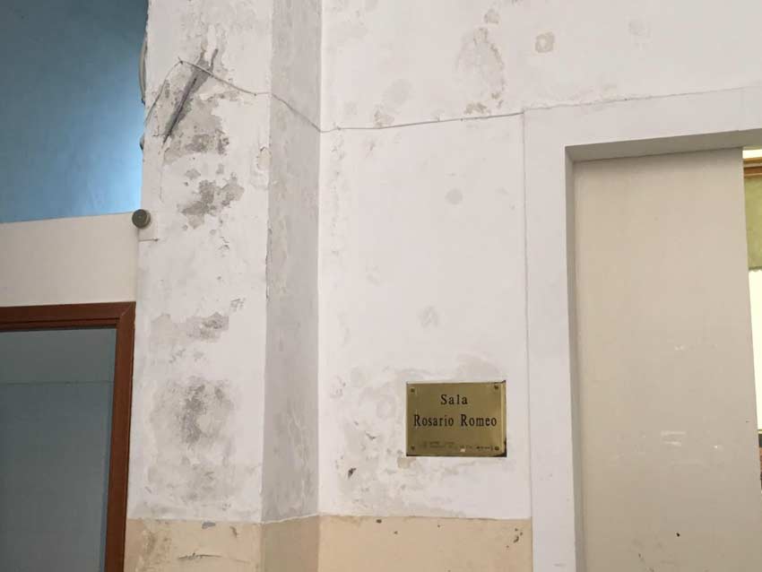 Con il trascorrere del tempo e, in mancanza di manutenzioni, gli ambienti sono ridotti ai minimi termini con le fenditure che attraversano le pareti da un lato all’altro. Al primo piano del palazzo comunale si trova invece la prestigiosa sala Romeo, utilizzata per convegni e manifestazioni istituzionali. Alla vigilia della ripresa delle attività culturali, la sala si presenta dimessa con le pareti annerite a causa delle infiltrazioni che hanno pesantemente danneggiato in parte anche la copertura. L’intonaco in alcuni punti si è staccato e in occasione di una pioggia di media entità i locali si allagano puntualmente.