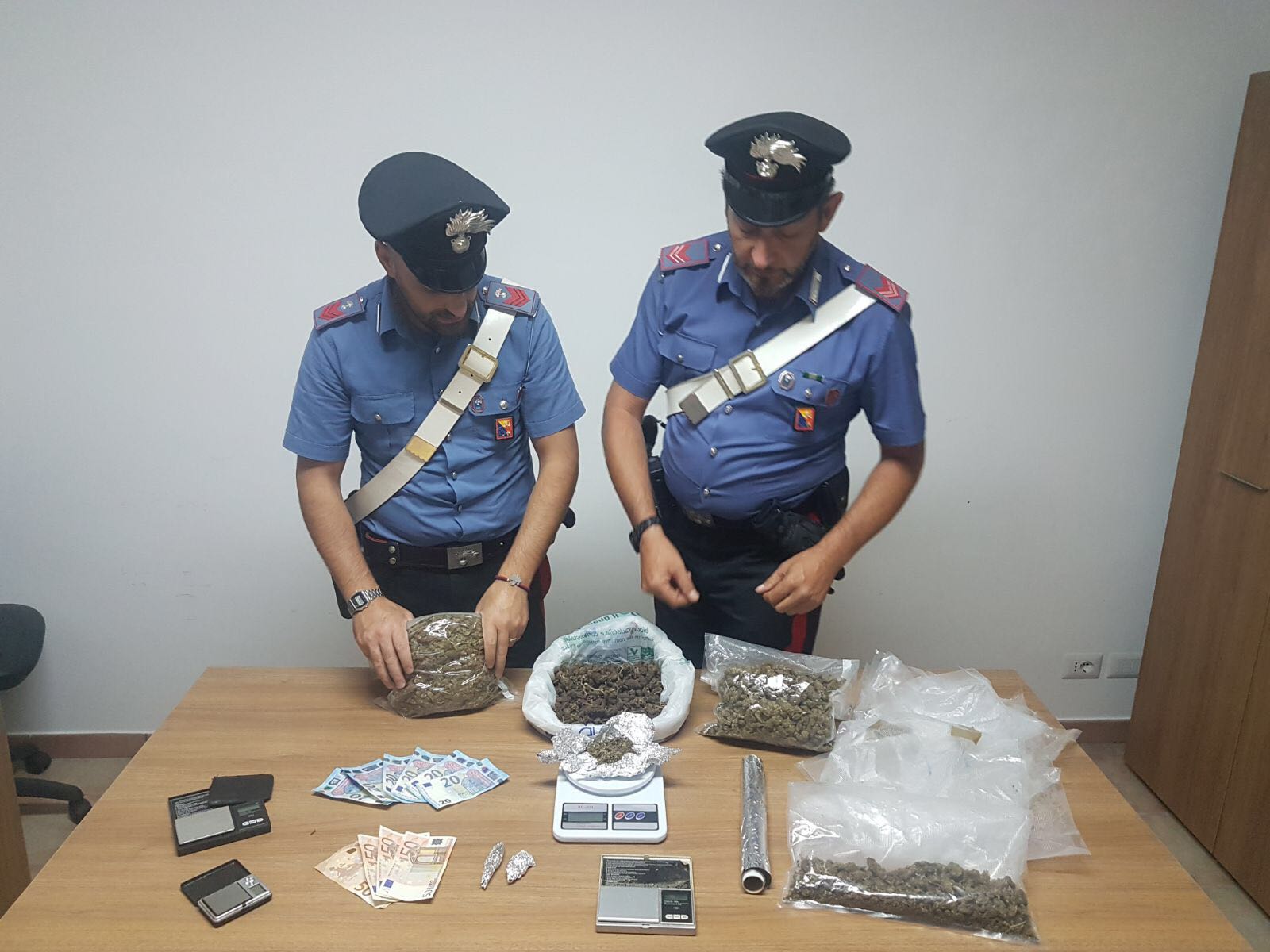 I carabinieri intervenuti dopo aver bloccato l’uomo nel quartiere di San Giovanni a Giardini Naxos, hanno poi proseguito il controllo nell’abitazione adibita a magazzino del fermato, in via delle Rimembranze a Giardini dove, ben celati all’interno di un mobile, i militari hanno rinvenuto un 1,5 kg di sostanza stupefacente del tipo marijuana suddivisa in 7 confezioni, micro dosi da 8 grammi e un 1,5 grammi, 6 buste con residui di marijuana, 4 bilancini di precisione e denaro contante custodito nel portafoglio dell’arrestato circa 350 euro.