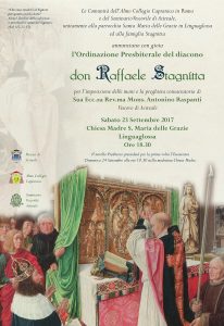 Oggi sabato 23 settembre 2017, nella chiesa madre S. Maria delle Grazie in Linguaglossa, alle ore 18.30, il diacono Raffaele Stagnitta riceverà l’ordinazione presbiterale per l’imposizione delle mani e la preghiera consacratoria di S. E. Mons. Antonino Raspanti vescovo di Acireale.