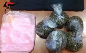 Nella circostanza il 19enne ha tentato di disfarsi di una busta lanciandola da una finestra delle veranda. La busta contenente oltre mezzo chilo di marijuana, suddivisa in 5 involucri, è stata recuperata dai carabinieri in strada e sottoposta a sequestro (foto a destra).