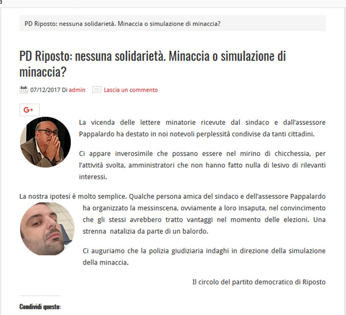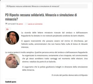 Credevamo di stare leggendo una barzelletta o di assistere ad uno scherzo di pessimo gusto e invece no. Purtroppo no. Piuttosto abbiamo letto un comunicato a commento delle recenti minacce ricevute dal sindaco di Riposto Enzo Caragliano ed all’assessore Gianfranco Pappalardo Fiumara (clicca e leggi Riposto, lettere minatorie con coltelli indirizzate al sindaco Caragliano e assessore Pappalardo Fiumara. Nelle missive esplicite minacce di morte) a “firma” del circolo ripostese del Pd ovvero a firma di quei rappresentanti (nelle istituzioni e non) di uno dei maggiori partiti italiani (il secondo per consensi dopo il Movimento 5 Stelle) che ci ha lasciato stupiti e disgustati. Fortunatamente non sono solo nostre tali sensazioni ma sono condivise da tanti, anche all’interno del circolo Pd di Riposto.