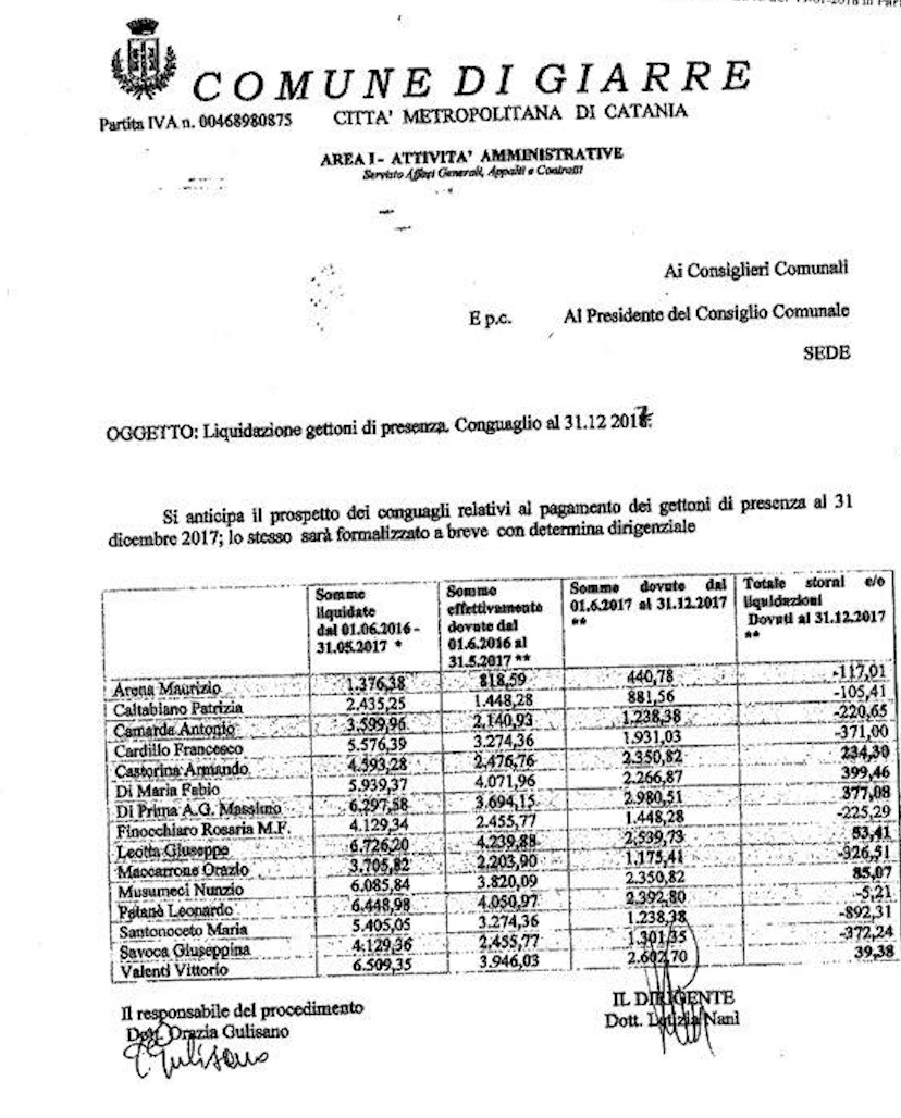 E’ stato notificato dalla dirigente dell’Area Attività Amministrative, Letizia Nanì, tramite posta elettronica certificata, il prospetto dei conguagli relativo al pagamento dei gettoni di presenza nel periodo compreso tra l’1 giugno 2016 e il 31 maggio 2017.