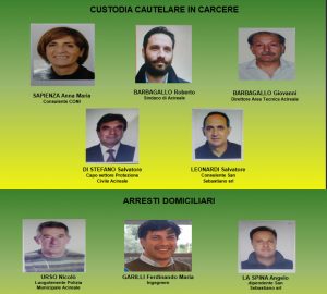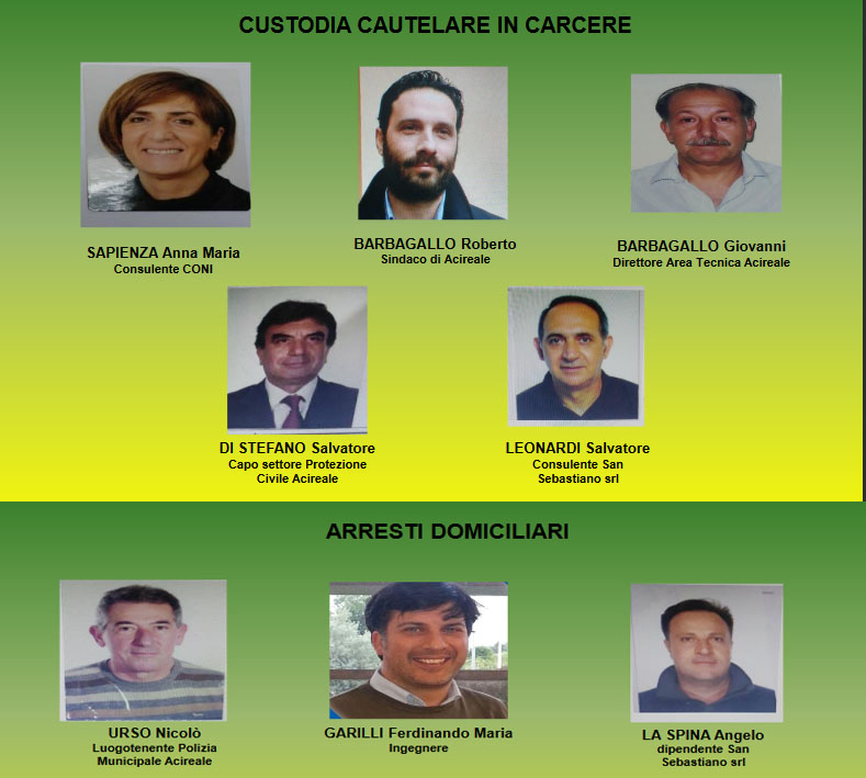 Le misure cautelari in carcere riguardano il sindaco di Acireale, Roberto Barbagallo, Salvatore Di Stefano, Giovanni Barbagallo, Anna Maria Sapienza e Salvatore Leonardi. Agli arresti domiciliari, Maria Ferdinando Garilli, Angelo La Spina e Nicolò Urso.