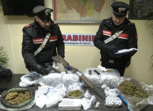 Nell’alloggio estivo, in via Marco Polo, i carabinieri ieri sera hanno rinvenuto una cospicua quantità di cocaina in pietra, circa due chili e inoltre circa 13 chili di marijuana, 150 grammi di eroina, 25 grammi di hashish bilancini di precisione e anche alcune armi: un fucile sovrapposto Beretta mod. S55 cal 12, con canne mozzate con matricola abrasa, una pistola Sig Sauer mod. P230 cal. 9 con matricola abrasa, caricatori e munizioni, predisposta per l’applicazione di silenziatore, 126 cartucce di vario calibro, una moto d’epoca Yamaha XT 600, rubata il 24 agosto 2017 ad Acireale, la somma in contante di 1580 euro, ritenuta provento dell’attività di spaccio, 6 bilance elettroniche e vario materiale utilizzato per il confezionamento dello stupefacente.