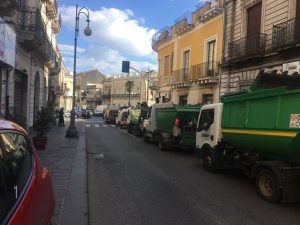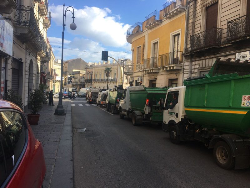 Clamorosa protesta degli operatori ecologici a Giarre. Poco dopo le 8 il viale Sturzo e via Callipoli sono stati invasi da numerosi mezzi tra cui autocompattatori e minivasche che, in fila, hanno paralizzato il traffico nell’orario di punta in concomitanza dell’apertura dei negozi del centro e delle scuole.