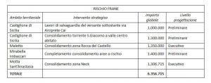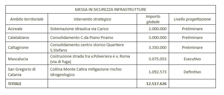 Nel Catanese, per la messa in sicurezza delle infrastrutture, ci sono 12,5 milioni di euro; contro il rischio alluvioni, 16,4; contro il rischio frane, 6,3 milioni. Tra i rifinanziamenti più cospicui i 5,2 milioni per la sistemazione idraulica tra S. Giovanni e Aci Platani ad Acireale; 3,35 milioni per il centro storico di Caltagirone e 3 milioni per il consolidamento di Piano Piraino a Calatabiano.