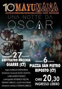 Un doppio evento, all’anfiteatro di Macchia di Giarre mercoledì 27 giugno e in piazza San Pietro a Riposto, venerdì 6 luglio. E’ tutto pronto per “Una notte da Oscar”, lo spettacolo conclusivo dell’Accademia Mayumanà di Giarre, al suo 10° anniversario di attività.