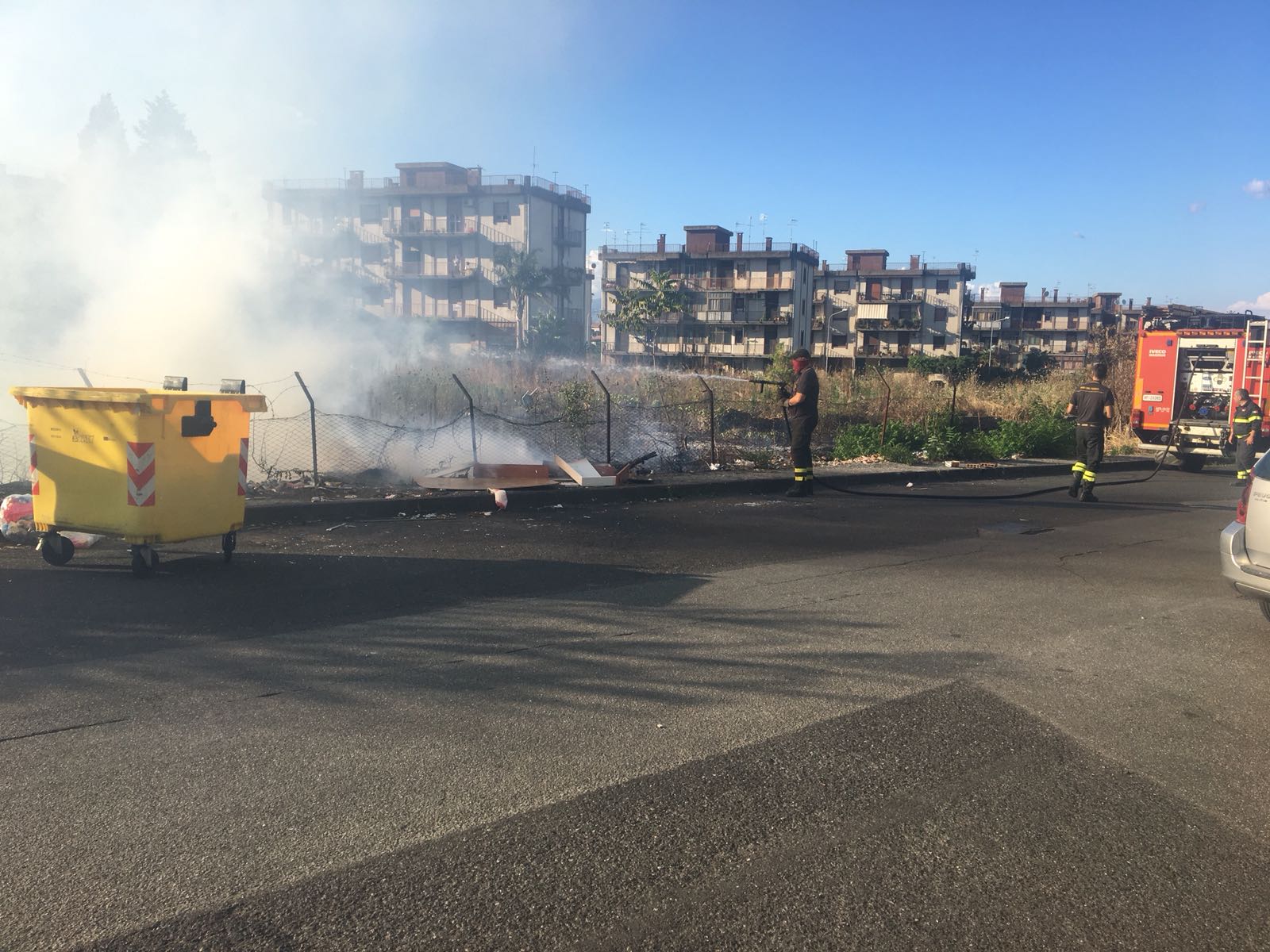 Ennesimo incendio questo pomeriggio in un terreno incolto e utilizzato a discarica in via Liguria a Giarre nel popoloso quartiere Jungo.