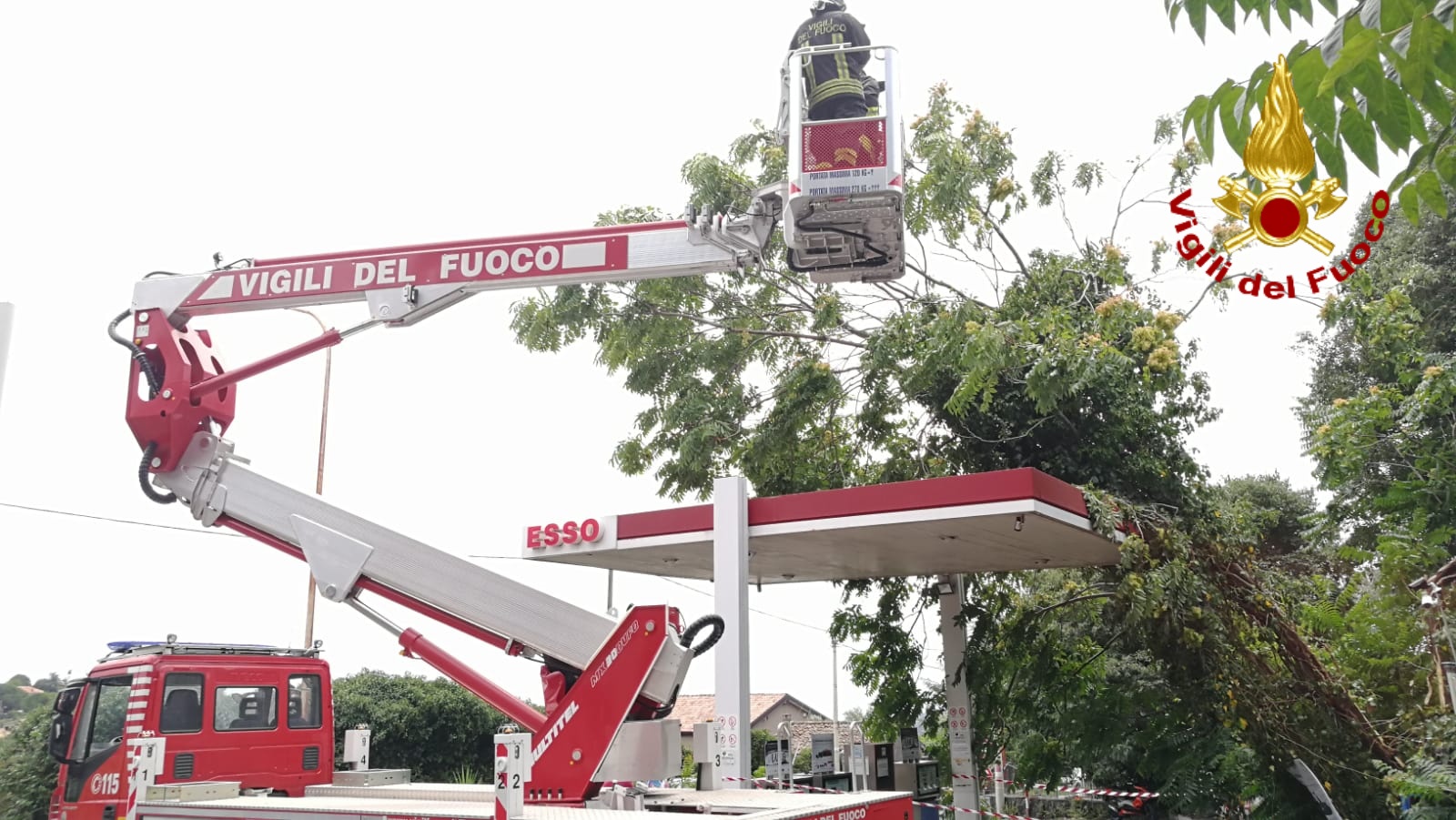 Tra gli interventi di soccorso più delicati, quello eseguito dai Vvff per la rimozione di un albero pericolante in una stazione di servizio di un distributore “Esso” a Trecastagni, in via Catania 64.
