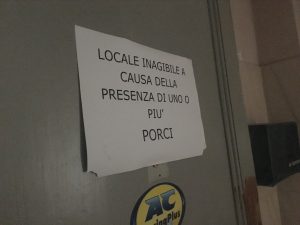 Sulla porta del wc una scritta in bella vista che offende il decoro del palazzo comunale per il linguaggio scurrile.