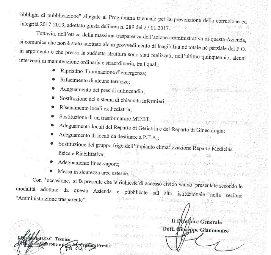 Vogliamo evidenziare che, a seguito dell’accesso agli atti che questo Comitato ha avviato nel gennaio del 2017, relativamente all’agibilità della struttura di Via Forlanini, si evince come non sia stato adottato dall’ASP alcun provvedimento di inagibilità, parziale o totale, e che anzi veniva comunicato che nell’ultimo quinquennio furono realizzati interventi di manutenzione ordinaria e straordinaria (Doc. all. 1), e sebbene i vertici dell’ASP, cui i Sindaci hanno dato credito, abbiano esposto tale tempistica di intervento, riteniamo tali dichiarazioni paradossali. Se la struttura è agibile quali sono i motivi per i quali si richiedono ulteriori sondaggi geologici e verifiche strutturali?