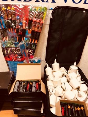 All’interno di un borsone nascosto dentro il pensile della cucina, venivano rinvenute 11 scatole contenenti petardi di categoria F4, notoriamente conosciuti come “THUNDER”, per un peso complessivo di massa attiva pari a 4620 gr., per il cui acquisto si esige il