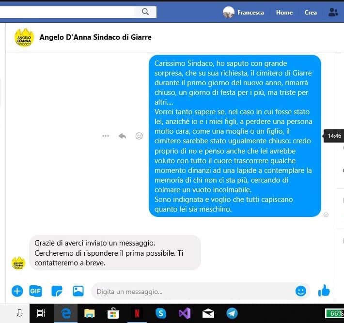 Analogamente nel cimitero di San Giovanni Montebello: oggi 26 dicembre apertura solo di mattina fino alle ore 12. Sui social, frattanto, la nota diffusa dal Comune ha suscitato reazioni di aperto dissenso (qualcuno ha accusato il sindaco sulla propria pagina FB per la sua inerzia), specie per le limitazioni imposte per la fruizione dei cimiteri, dove nel frattempo, in particolare, a Trepunti, si segnalano disservizi di vario genere, tra cui lo stato di incuria con cumuli di rifiuti vegetali abbandonati a ridosso delle tombe e l’assenza di personale per assistere l’utenza.