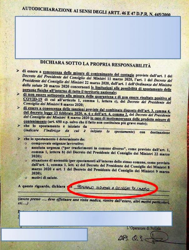 Nella circostanza, a seguito delle vane rimostranze avanzate da alcuni condomini del palazzo alla luce delle disposizioni governative in vigore, è stato necessario l’intervento dei Carabinieri che, appena giunti sul posto, si sono tra l’altro visti esibire delle autocertificazioni riportanti la dicitura come giustificazione “pranzavo insieme a colleghi di lavoro”.