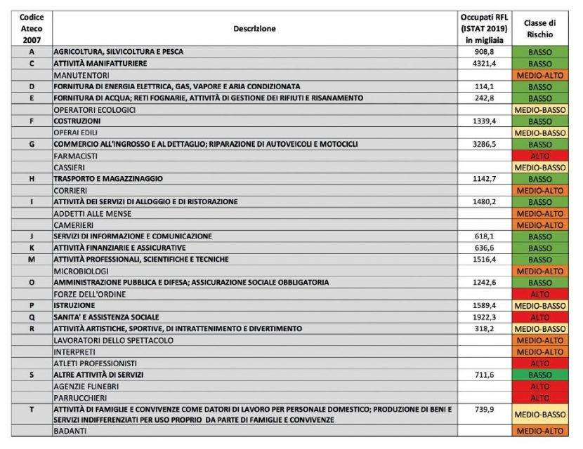 Nel documento redatto da Inail è presente una tabella orientativa circa le classi di rischio attribuibili ai diversi codici Ateco (Allegato 1 al “Documento tecnico sulla possibile rimodulazione delle misure di contenimento del contagio da SARS-CoV-2 nei luoghi di lavoro e strategie di prevenzione“).