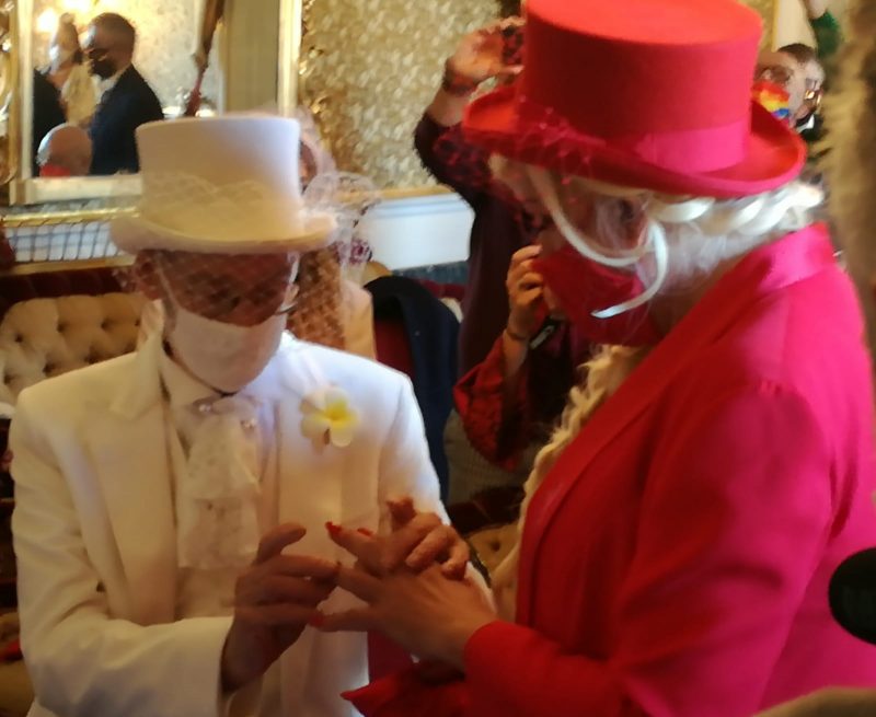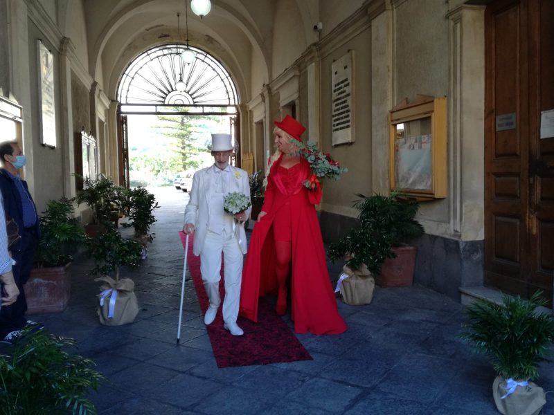 Gino indossava un elegante smoking bianco, con il cilindro. Massimo un abito lungo rosso sgargiante con la coda e i nomi di Giorgio e Toni cuciti sul doppio petto della giacca: «Il rosso è la nostra passione, il nostro amore – dice Massimo -. E’ una giornata soprattutto per Giorgio e Toni, perché loro non hanno potuto essere felici come noi. Noi siamo qui soprattutto per questo. Giarre ha un momento per ricordare, per cancellare una ferita con un gesto d’amore».