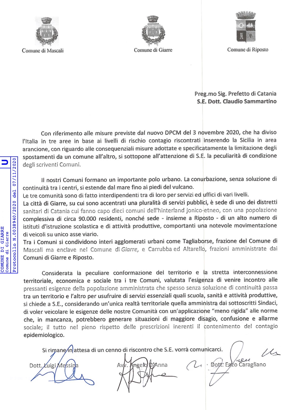Con riferimento alle misure previste dal nuovo Dpcm del 3 novembre scorso, con particolare riguardo alle consequenziali misure adottate e specificatamente la limitazione degli spostamenti da un Comune all’altro, si sottopone all’attenzione del prefetto di Catania Claudio Sammartino, la peculiarità di condizione dei Comuni di Giarre, Mascali e Riposto che formano un importante polo urbano.