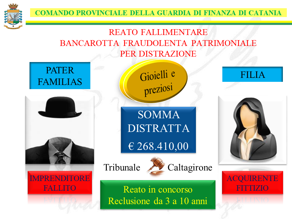 Le attività di indagine delle Fiamme Gialle della Compagnia di Caltagirone, delegate dalla locale Procura della Repubblica, hanno fatto piena luce sulle vicende che hanno portato al fallimento di una società operante nel campo della rivendita di gioielli e preziosi, riferibile a due imprenditori ricadenti nella circoscrizione della Compagnia di Caltagirone.