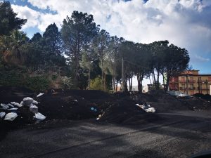 Montagne di cenere invadono il piazzale che si trova dietro la villa di San Giovanni Montebello. Una scena che ricorda più le immagini da Marte inviate dalla sonda della Nasa che quelle di un Comune italiano.