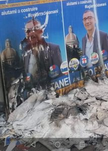 Ignoti autori hanno imbrattato i manifesti elettorali che ritraevano il volto del candidato usando in taluni casi uno spray nero; in altri casi hanno stracciato i manifesti e peggio ancora in taluni episodi vi hanno anche dato fuoco.