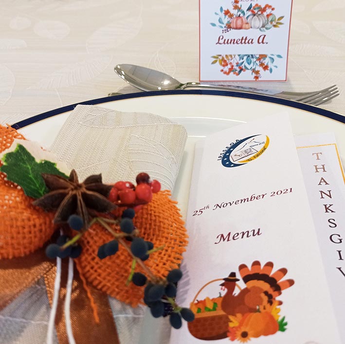 Da sfondo al ricco menù del ringraziamento, l’elegante Sala Orange con al centro il tavolo imperiale e agli estremi quattro tavoli rotondi con composizioni floreali, candele, decorazioni tipiche del giorno del ringraziamento preparate dalle classi 1^A, 2^I, 4^A e 5^A Accoglienza, e una mise en place all’altezza dei più prestigiosi ristoranti.