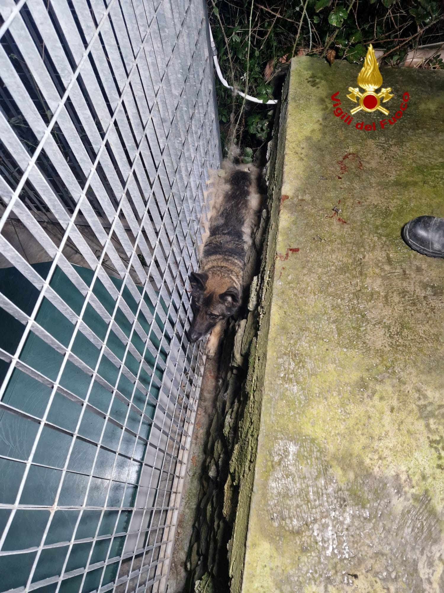 Si trattava di “Fero”, una pastore tedesco caduto e rimasto incastrato tra la recinzione di un box ed un muretto, che aveva anche difficoltà a respirare per lo spazio angusto nel quale si era venuto a trovare.