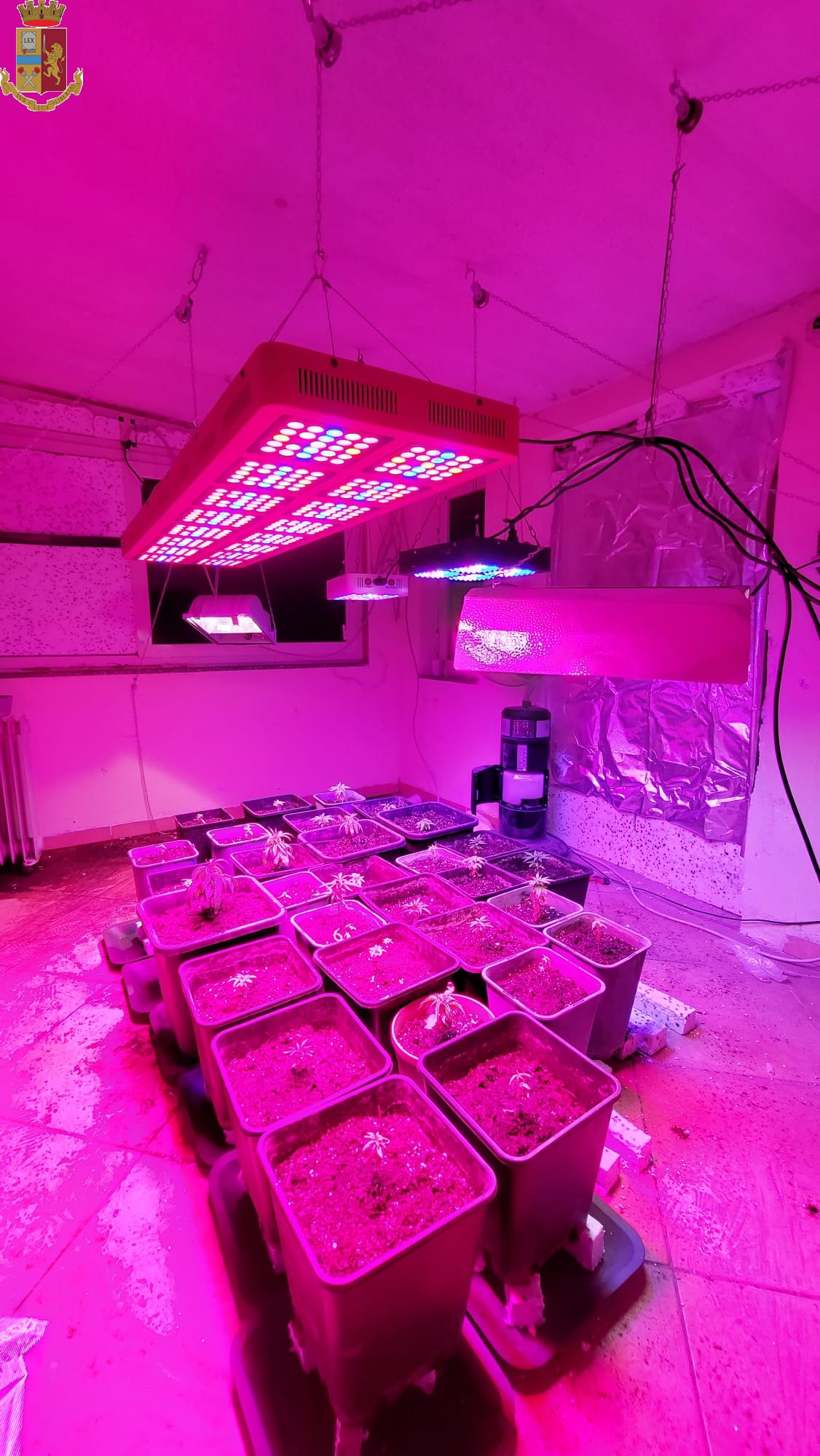 Il personale del predetto Commissariato, recatosi sul posto, constatava che, effettivamente, erano lì presenti 30 vasi con altrettante piantine in fase di crescita e tutto il necessario per la loro coltivazione: un estemporaneo mini-impianto idrico, lampade alogene e a infrarossi, deumidificatori e ventilatori. Il tutto veniva smontato, sottoposto a sequestro e trasferito presso i locali del Commissariato.