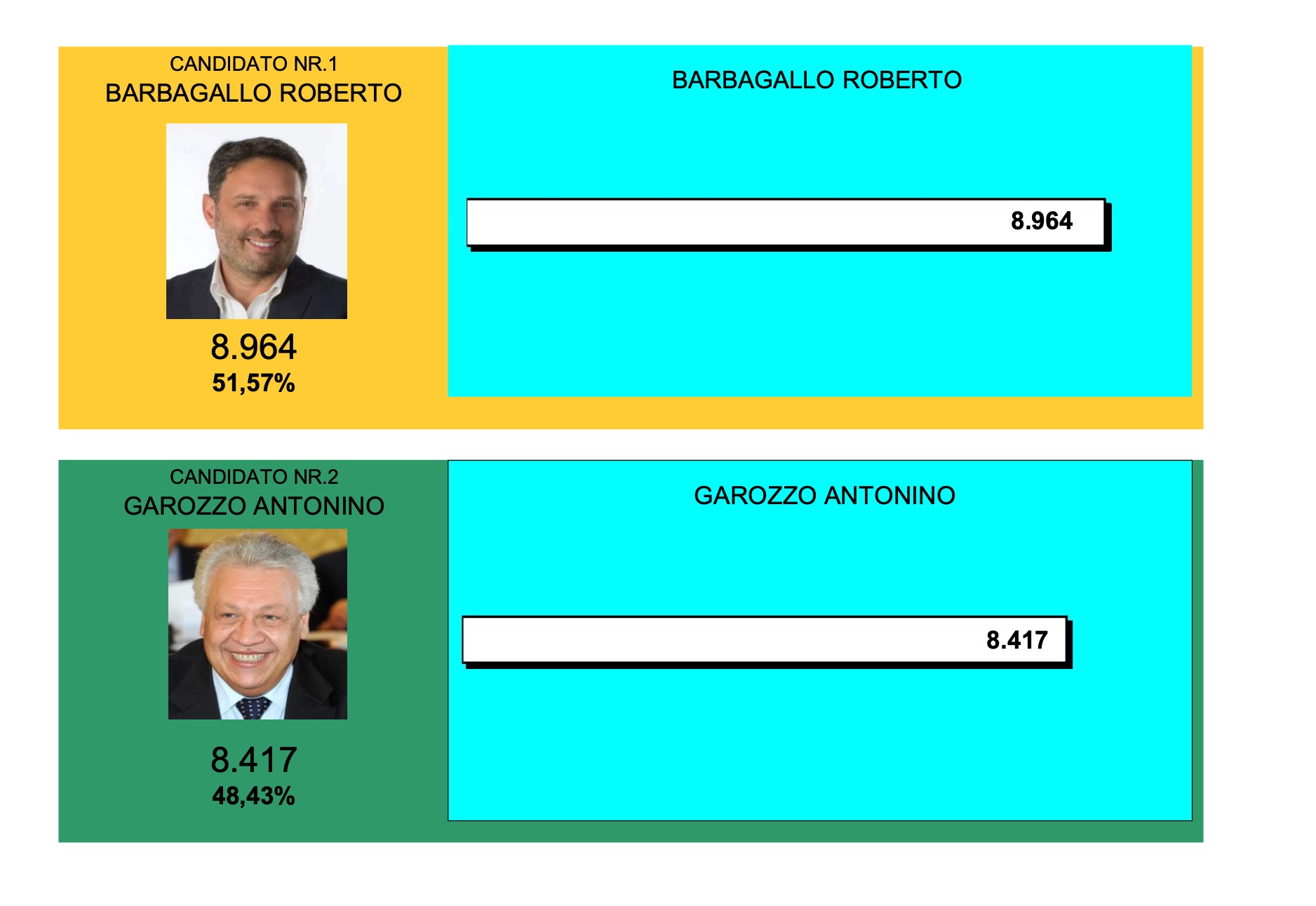 ORE 17 Barbagallo ha vinto con il 51,88 per cento dei consensi pari a 8964 voti. Garozzo si è fermato al 48,13 per cento, raccogliendo 8316 preferenze all’interno delle 56 sezioni della città dei cento campanili.