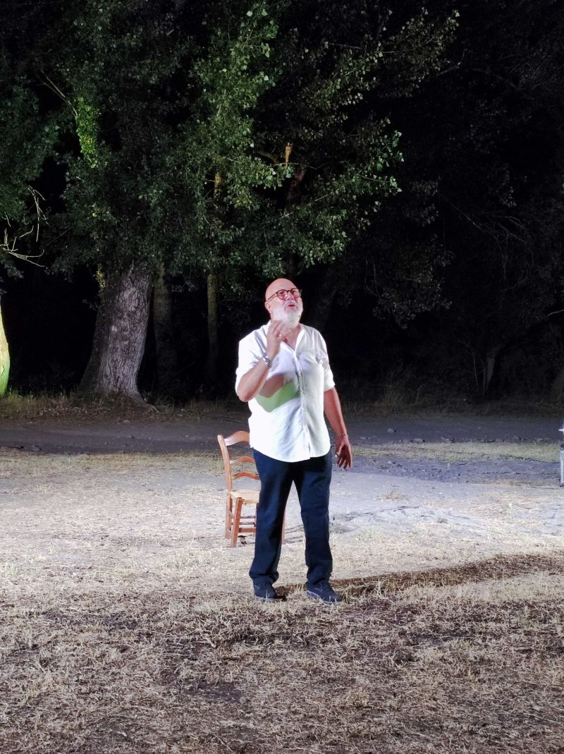 Attraverso un sentiero che conduce sulle rive del fiume San Paolo, il pubblico ha quindi raggiunto le gradinate dell’anfiteatro per assistere alla recita “Nannu, Mu cunti un cuntu?”, una serie di racconti e aneddoti siciliani (inediti) proposti con verve narrativa  da Ciccino Sciacca, che si conferma brillante uomo di spettacolo, interpretando sia ruoli comici che drammatici, una performance molto apprezzata dal pubblico, in particolare le storielle “Donna Cuncetta”, “U cuntu Santr’opu” e Gna Rosa-l’ogghiu”.