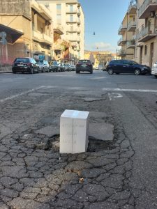 Quello di via Cairoli, frutto della esasperazione dei cittadini, non è il primo episodio del genere. Recentemente per segnalare le buche sono state usate delle sedie vicino funzione di transenna e pneumatici e grossi massi, posizionati all’interno delle caditoie prive di griglia, lungo il viale Federico II di Svevia.