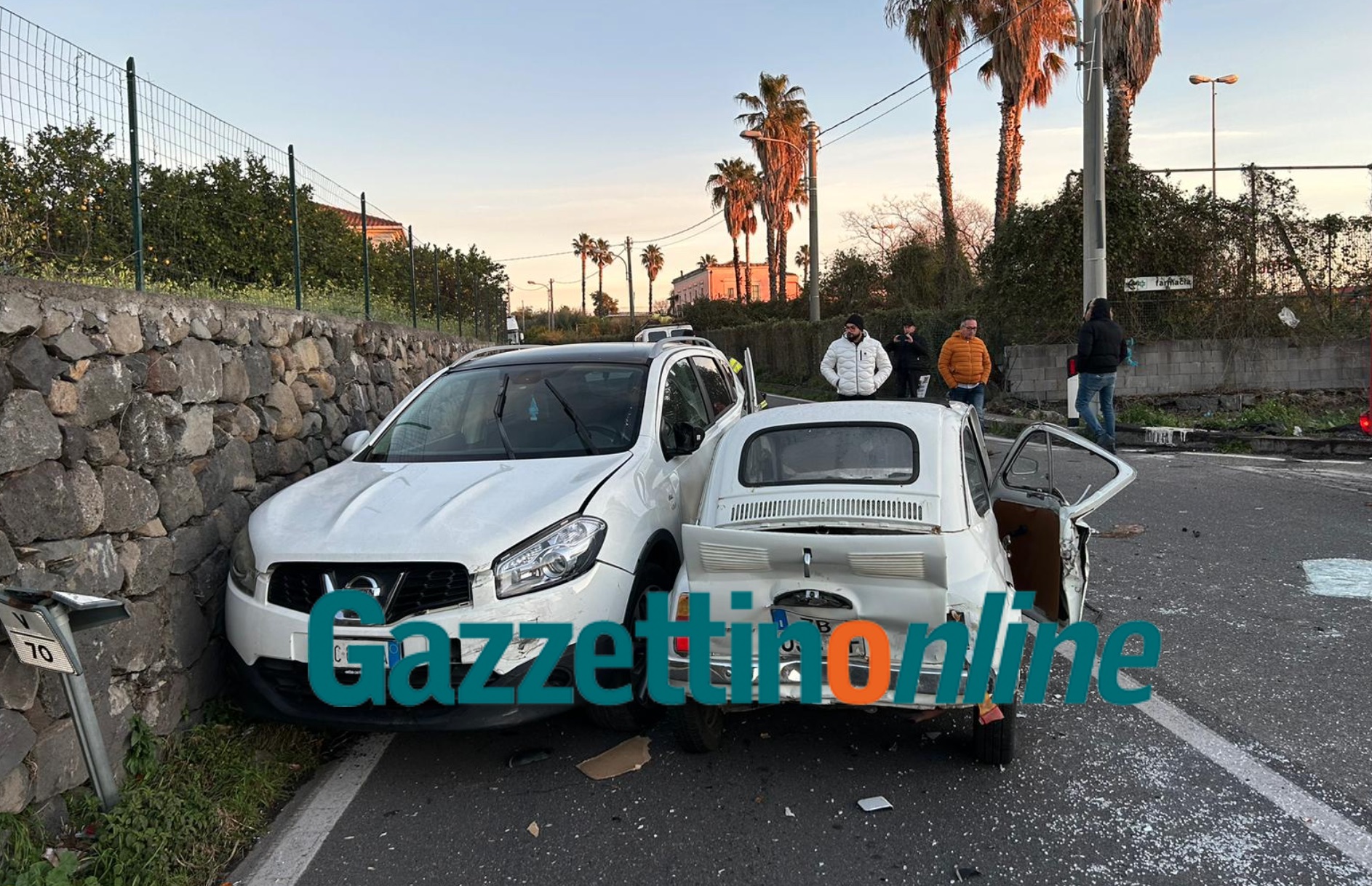 Ad avere la peggio il conducente di una vecchia 500 che percorreva la Statale in direzione Acireale. La mini utilitaria, a quanto pare, si apprestava a svoltare sulla propria sinistra per raggiungere il polo industriale, quando, sulla carreggiata opposta sopraggiungeva un furgone Ducato che ha centrato in pieno la 500. Nel frangente, in seguito alla potente collisione, le auto che seguivano da vicino la 500 si hanno dato vita, a loro volta, ad un tamponamento a catena.