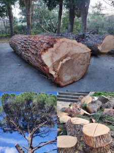 Il taglio del possente esemplare di Pinus, che presentava “una scarsa attività vegetativa, con conseguente disseccamento della chioma”, si è reso necessario “per porre in sicurezza l’area”, a tutela dell’incolumità pubblica, e per evitare “possibili danni ai monumenti funebri sottostanti” (Delibera della Giunta Municipale n. 188 del 23 dicembre 2022), ma anche volto al “ripristino della pavimentazione del vialetto cimiteriale”, danneggiata dalle radici dell’albero.